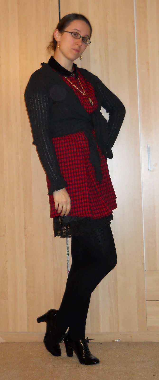 Quickly, about my Valentine's Day outfit from yesterday...didn't do much besides go to work, as the boyfriend and I decided to go out tonight instead (had a great deal for a fancy dinner on Tuesday or Wednesday nights). I still wanted to be somewhat holiday-appropriate, which led to the red dress that I had finally finished hemming over the weekend (it used to be floor-length with long sleeves. Far too much red plaid for me.) The overall ensemble ended up being referred to as "Gothic Lolita" by a coworker...not sure what I think about that!